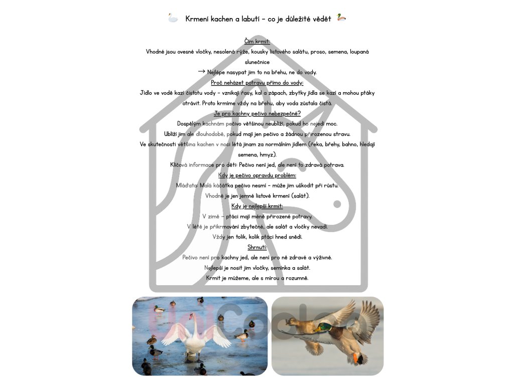 - VŽDY bonusový materiál: MatiKarty s obrázky k přiřazování, WowKarty - prosvětlovací obrázky, Krmení kachen a labutí, Jak rozeznat krkavcovité.